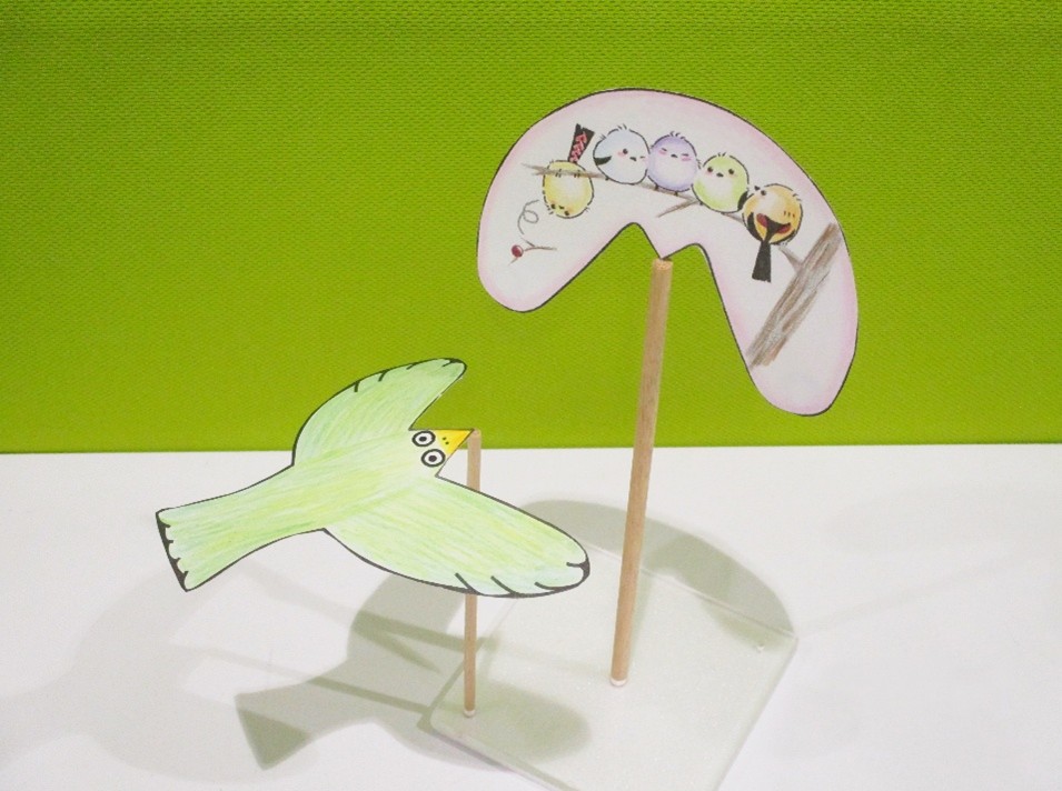 | ソーマトロープ 回すと裏表の絵が1つに見えるおもちゃをつくります。 |