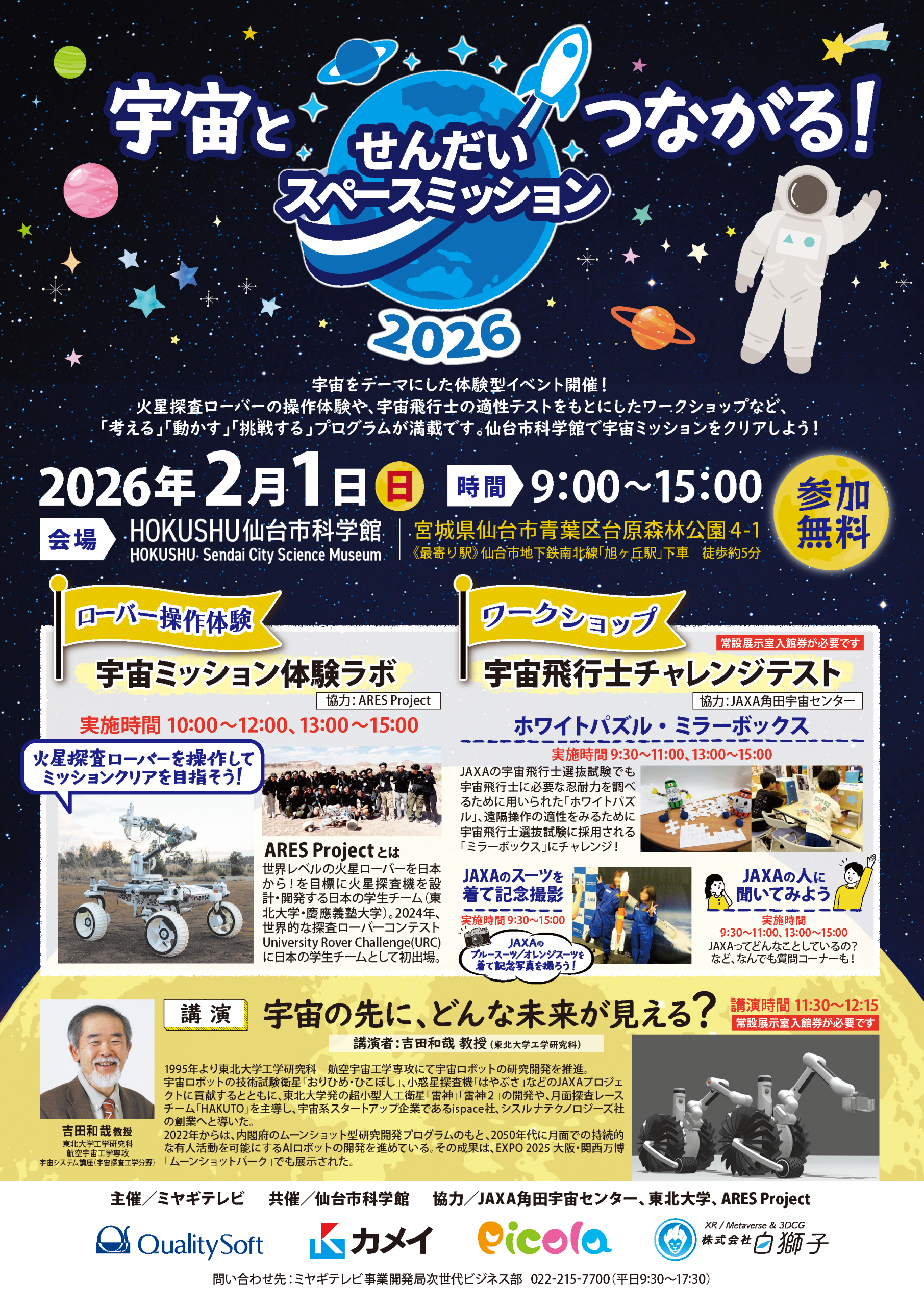 宇宙をテーマにした体験型イベント開催!火星探査ローバーの操作体験や、宇宙飛行士の適性テストをもとにしたワークショップなど,「考える」「動かす」「挑戦する」プログラムが満載です。仙台市科学館で宇宙ミッションをクリアしよう!